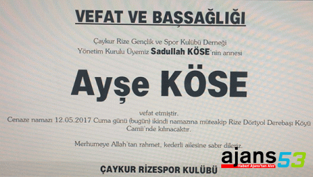 Cuma günü Yarın Dörtyol Derebaşı köyünde ikindi namazına mutakip aile kabristanlığına defin edilecek olan Ayşe Köse için Rizespor yönetim kurulu baş sağlığı ilanı yayınladı.