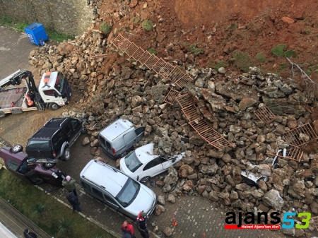 Trabzon'da, istinat duvarının çökmesi sonucu park halindeki 14 araç ve bir motosiklet göçük altında kaldı.