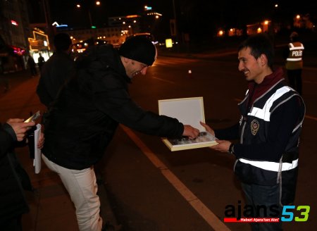 - Yılbaşı dolayısıyla uygulama ve kontrollerini artıran trafik ve asayiş ekipleri, uygulama sırasında vatandaşlara çikolata ikram etti