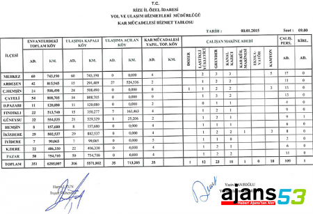 Yoğun kar yağışı nedeniyle il merkezinde 60, Ardeşen'de 15, Çamlıhemşin'de 24, Çayeli'nde 54, Derepazarı'nda 11, Fındıklı'da 15, Güneysu'da 21, Hemşin'de 8, İkizdere'de 29, İyidere'de 7, Kalkandere'de 22 ve Pazar'da 50 olmak köy yolu ulaşıma kapandı.
