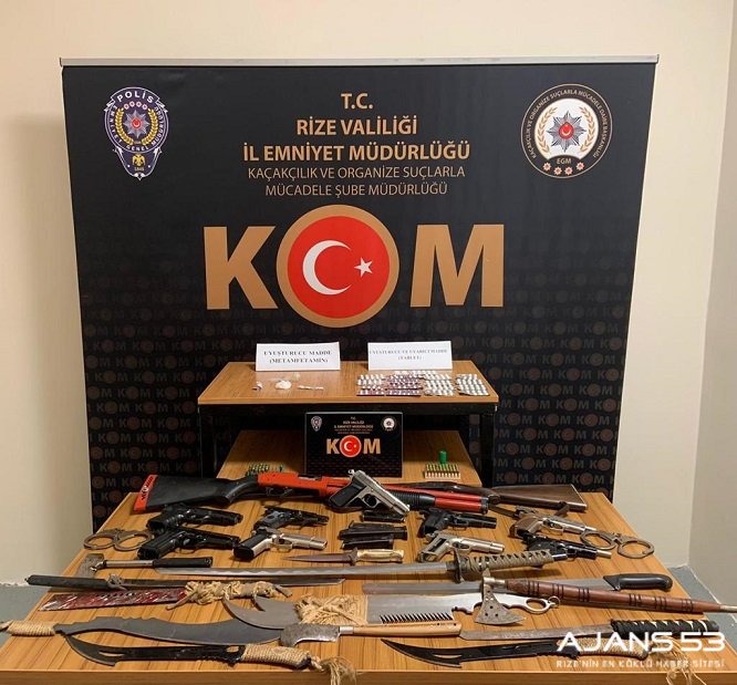 Rize'de bir iş yerinde 1 ruhsatsız, 6 kurusıkı tabanca, uyuşturucu madde ile çok sayıda kesici alet ele geçirildi.
