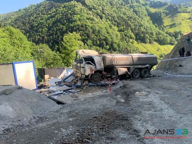 Rize'nin İkizdere ilçesinde, freni patlayan kamyonun çarptığı su tankerinin güvenlik kulübesi üzerine devrildiği kazada 1 kişi öldü, 3 kişi yaralandı. Alınan bilgiye göre, ilçenin Cevizlik köyündeki taş ocağında, Mehmet Morgil'in kullandığı 53 K 4655 plakalı taş yüklü kamyon, freninin patlaması sonucu şantiye girişinde bekleyen Dursun Yılmaz (49) idaresindeki 06 FY 7335 plakalı su tankerine çarptı. Çarpmanın etkisiyle tanker, şantiyedeki güvenlik kulübesinin üzerine devrildi. Tanker sürücüsü Yılmaz ile kulübede bulunan güvenlik görevlileri Enver Demirci (32), Yunus Aksu (28) ve Samet Öztürk (29) yaralandı. Olay yerine jandarma, AFAD, 112 Acil Servis ile İkizdere Arama Kurtarma ekipleri sevk edildi. Ambulanslarla kentteki hastanelere kaldırılan yaralılardan Enver Demirci, müdahalelere rağmen kurtarılamadı. Kazayla ilgili soruşturma başlatıldı.