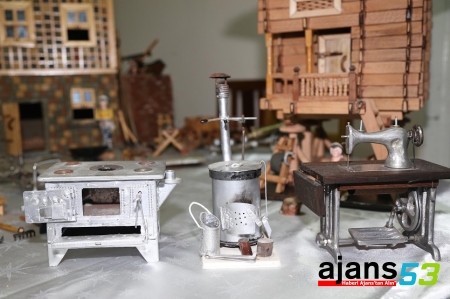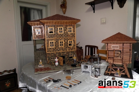 "Kum, kiremit tozu gibi şeyleri de minyatürlerin süslemesi için kullanıyorum. Bulduğum her türlü atığı değerlendirmeye çalışıyorum. Yöre mimarisine uygun minyatür ahşap veya taş evleri, serender, kuzine, bahçe aletleri, motorlu taşıt, dikiş makinesi gibi günlük hayatta kullandığımız objelerin minyatürünü yapıyorum."