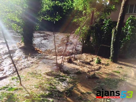 Çamlıhemşin ilçesinde akşam saatlerinde etkili olan yağış nedeniyle derenin taşması sonucu Ayder Yaylası'na ulaşımı sağlayan yola ağaç ve taş parçaları sürüklendi.