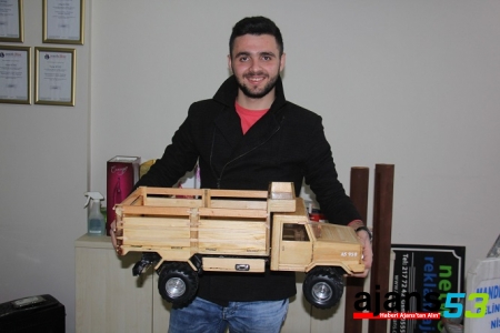 Bir zamanların en meşhur kamyoneti olan damperli Bedford’dan esinlenerek ahşap maketini yapan Ayder “Ahşap işler benim hobim. Sürekli ne yapabilirim diye düşünüyordum. Ahşap kamyon yapmayı düşündüm. Komple ahşap sadece lastikleri plastik. Motor aksamını oyuncak arabadan aldım. Diğer lambalarını, sinyal sistemlerini de hazır aldım. Diğer montajları bana ait. Toplam maliyet 500 liraya mal oldu. Küçük olduğu için ucuz miktar oldu” dedi.