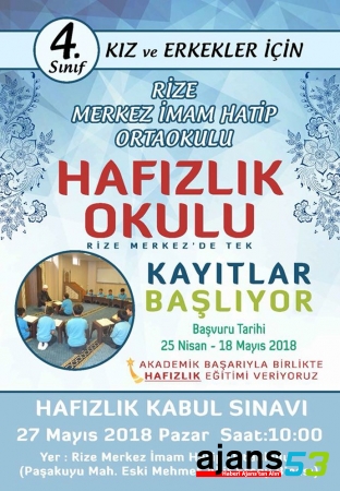 Rize Merkez İmam Hatip Ortaokulu’nda örgün eğitimle birlikte hafızlık eğitimi projesi kapsamında hafızlık eğitimi müracaatları başladı.
