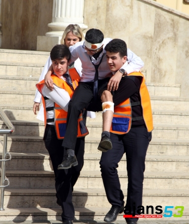 Tatbikat sirenlerin çalması ile başladı. İlk önce öğrenciler tahliye edildi. Tatbikat gereği yaralı öğrenciler, arkadaşlarının omzunda sınıftan çıkartıldı.