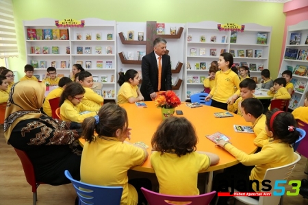 Vali Ersin Yazıcı ve Bayan Yazıcı, kütüphanenin açılışını okulun öğrencileri ile birlikte yaparak, bir süre kütüphanede incelemelerde bulundu.