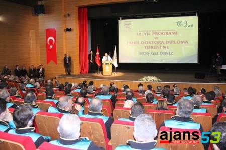 Sabah saatlerinde havayolu ile Trabzon'a gelen ve ardından memleketi Rize'ye geçen Türkiye Büyük Millet Meclisi (TBMM) Başkanı İsmail Kahraman, Recep Tayyip Erdoğan Üniversitesi (RTEÜ) 10'uncu yıl dönümü kutlama törenine katıldı. RTEÜ Ana Salonu'ndaki törende TBMM Başkanı İsmail Kahraman'ın yanı sıra Cumhurbaşkanlığı Genel Sekreteri Fahri Kasırga, MGK Genel Sekreteri Seyfullah Hacımüftüoğlu ve akademisyenler yer aldı. Üniversitelerde ve okullarda müdürlük ve rektörlük yapan akademisyenlere ödül verildikten sonra TBMM Başkanı Kahraman'a RTEÜ Konseyi tarafından 'Siyaset Bilimi' dalında Fahri Doktora unvanı takdim edildi. Doktora cübbesini RTEÜ Rektörü Prof. Dr. Hüseyin Kahraman'ın elinden giyen TBMM Başkanı Kahraman'a doktora belgesi de verildi.