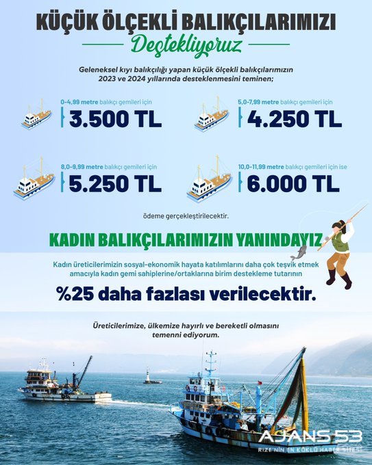"0-4,99 metre balıkçı gemileri için 3 bin 500 lira, 5-7,99 metre balıkçı gemileri için 4 bin 250 lira, 8-9,99 metre balıkçı gemileri için 5 bin 250 lira ve 10-11,99 metre balıkçı gemileri için ise 6 bin lira ödeme gerçekleştirilecek. Kadın gemi sahiplerine veya ortaklarına birim destekleme tutarının yüzde 25 daha fazlası verilecek. Üreticilerimize, ülkemize hayırlı bereketli olmasını temenni ediyorum."
