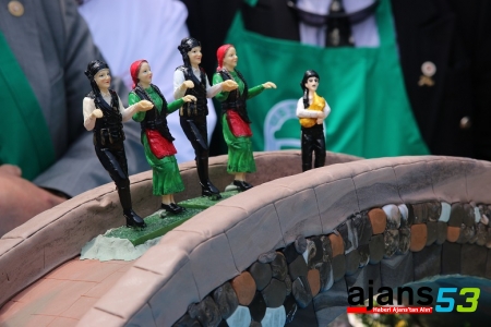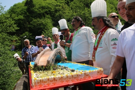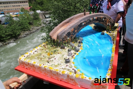 Daha sonra Çamlıhemşinli pasta ustaları tarafından 80 kilogram malzeme kullanılarak 2 günde tamamlanan "Fırtına Deresi üzerinde kemer köprü" figürlü pasta kesildi.