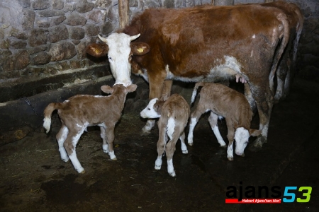Bayburt'ta, doğal yöntemle döllenen simental cinsi inek, ilk doğumunda 3 dişi buzağı dünyaya getirdi.