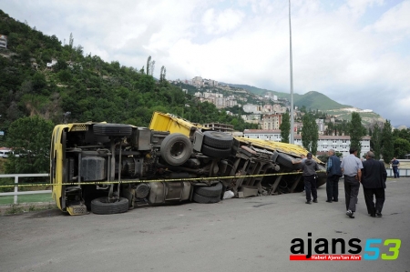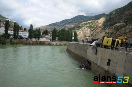Yoldaki çökme nedeniyle devrilen kamyon, yol ile nehir arasındaki bariyerlere çarparak durdu. Kamyonun kasasındaki un torbalarının bir bölümü nehre yuvarlandı.