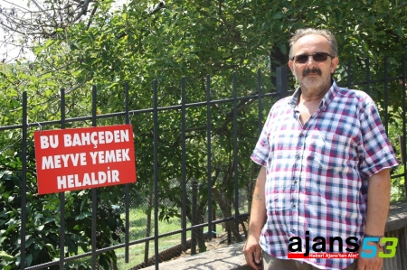 Ünye’nin Saca Mahallesi’nde ikamet eden üretici Yüksel Kulaçoğlu, yol kenarında bulunan evinin bahçesindeki meyveleri insanların rahatlıkla yiyebilmesi için, bahçe çitlerine “Bu bahçeden meyve yemek helaldir!” yazısı astı.