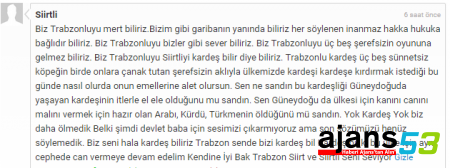 ‘Biz Trabzonluyu mert biliriz.Bizim gibi garibanın yanında biliriz her söylenen inanmaz hakka hukuka bağlıdır biliriz. Biz Trabzonluyu bizler gibi sever biliriz. Biz Trabzonluyu üç beş şerefsizin oyununa gelmez biliriz. Biz Trabzonluyu Siirtliyi kardeş bilir diye biliriz.Trabzonlu kardeş üç beş sünnetsiz köpeğin birde onlara çanak tutan şerefsizin aklıyla ülkemizde kardeşi kardeşe kırdırmak istediği bu günde nasıl olurda onun emellerine alet olursun.