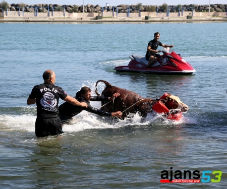 Yaklaşık 3 saatlik çalışmanın ardından büyükbaş kurbanlık, botla çekilerek Büyükşehir Belediyesi Mert Plajı mevkisinden kıyıya çıkarıldı. Polislere zor anlar yaşatan tosunu kaçmasını engellemek için gemiden gelen personel, ayaklarından bağladı.