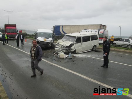 Edinilen bilgiye göre, Trabzon’un Arsin ilçesinde Rize istikametinden Trabzon’a gelen özel servis minibüsü yolun yağış nedeniyle kayganlaşması ve dikkatsizlik sonucu karşı şeride geçerek karşı şeritten gelen 08 DD 800 plakalı otomobille çarpıştı. Kazada her iki otomobilde bulunan 6 kişi yaralanırken, yaralılar Trabzon’da bulunan çeşitli hastanelerde tedavi altına alındı. Kazayla ilgili inceleme sürüyor.