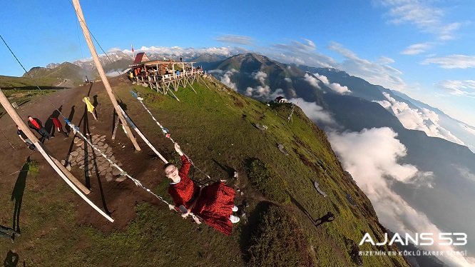 Yaylada sis bulutlarını izlerken salıncakta ve kayık üzerinde fotoğraf çektirmek isteyen ziyaretçiler sıranın kendilerine gelmesini bekliyor.