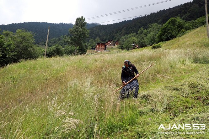 Rize'nin İkizdere ilçesindeki yaylalarda yaşayan kadınlar, ev işlerinin yanı sıra hayvanlarının kış mevsimindeki yiyecek ihtiyaçlarını karşılamak için arazideki otları biçiyor.