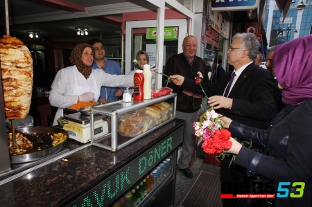 Kermes, kitap reyonları ve el işlemesi eserlerin bulunduğu çadırın gezilmesinden sonra Atatürk caddesi boyunca esnaflara ve vatandaşlara Başkan Kasap ve Müftü Doğan tarafından çiçek dağıtıldı.