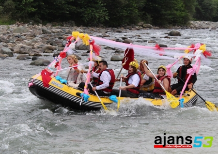 Rize’nin Ardeşen ilçesinde gerçekleştirdikleri çılgın düğün ile dünya evine giren çift, rafting botunu düğün aracı yapınca davetlilerde bindikleri rafting botları ile konvoy oluşturup çifte eşlik etti.