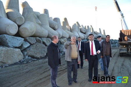 Karal balıkçı barınağı inşaat alanına giderek burada yüklenici firma sahibi Hızır Hop’tan bilgiler aldı.