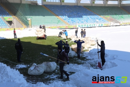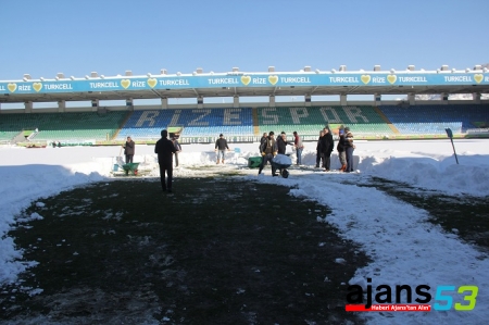 Çaykur Rizespor ile Mersin İdmanyurdu Ziraat Türkiye Kupası D Grubu son maçında yarın saat 17.00'de karşı karşıya gelecek. Mücadele öncesi üç gün etkili olan yoğun kar yağışı sonucu Çaykur Didi Stadyumu'nda 1 metre kalınlığında kar kütlesi oluştu. Sahanın maç saatine hazır hale getirilebilmesi için çalışmalara bir gün öncesinden başlandı. Zeminin zarar görmemesi için kar temizleme çalışmaları küreklerle ve el arabaları ile yavaş bir şekilde gerçekleştiriliyor.