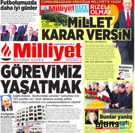 Gazetenin birinci sayfasında Cumhurbaşkanı Erdoğan'ın yazısı, "Cumhurbaşkanı Erdoğan Milliyet'e yazdı" başlığıyla manşetten verildi: