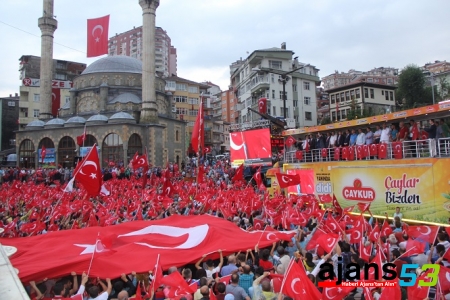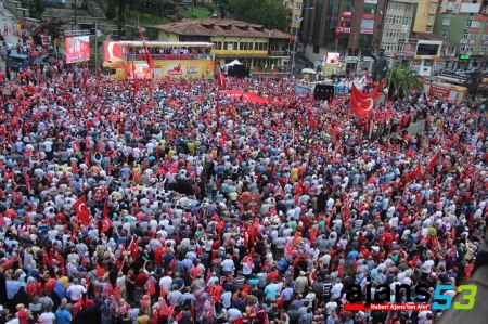 Rize 15 Temmuz Cumhuriyet ve Demokrasi Meydanı’nda düzenlenen Demokrasi Mitingine farklı siyasi fikirlere mensup, farklı sivil toplum kuruluşlarından binlerce katıldı. Türk bayraklarını alan herkes meydana akın etti. Yağmura rağmen meydan tıka basa doldu. Mitingde saygı duruşu ve İstiklal Marşı’nın ardından ilk konuşmayı Rize Valisi Erdoğan Bektaş yaptı. Bektaş konuşmasında Türkiye’nin karşı karşıya kaldığı saldırılara neden olarak, petrol üreten Arap ülkeleri ile Türkiye arasında gerçekleştirilen gizli alışverişi gösterdi. Bektaş emperyalist ülkelerin petrol üreten Arap ülkelerini sömürdüğünü, bu ülkelerin Türkiye’yi bur kurtarıcı olarak gördüklerini söyledi.