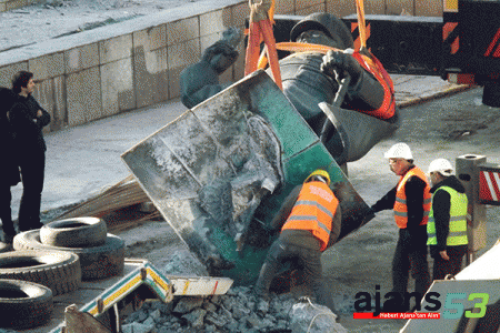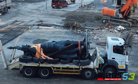 2 vinçle kaldırılan Atatürk heykeli boyun ve koltuk altı ile ayaklarına bağlanan halatlar ile TIR üzerine yerleştirilen araç lastiklerinin üzerine yerleştirildi.