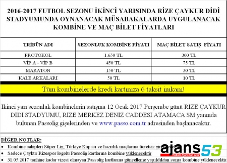 Çaykur Rizespor İkinci Yarı Kombine Fiyatları