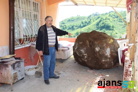 Giresun’un Görele ilçesi Cillioğlu mahallesinde dün gece fındık bahçesindeki kayalıklardan kopan tonlarca ağırlığındaki dev kaya kütlesi yaklaşık 200 metre yuvarlandıktan sonra Talip Kaçar’a ait evin balkonuna düştü. Balkonun hemen ardındaki odada kalan ev halkı ise deprem korkusuyla uyandı.