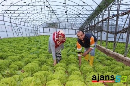Satılmış “Bu dik arazide sera olmadan daha önce kışları ıspanak ve yazları patates ekiyorduk. Ancak daha sonra devletimizin verdiği destekle buraya sera yaptık. Başka arazimizi yoktu. Mecbur bu dik araziye sera kurduk. Yolumuz da yukarıda olduğu için buradaki ürünü yola çıkarmak arabaya yüklemek zor oluyor. Burayı geri ödemesiz hibesiz destekle 30 bin TL’ye yaptırdık. Antalya’dan getirdiğimiz fideleri buraya dikerek burada marul ve yeşillik üretiyoruz. Her şeye rağmen üretmek zor ama güzel” dedi.