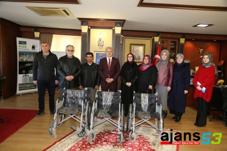 Engelli vatandaşlarımız Fatma Sarıhan, Emine Baş ve İsmail Gumba adına tekerlekli sandalyeleri yakınlarına Rize Belediye Başkanı Prof. Dr. Reşat Kasap, Ak Parti Rize İl Kadın Kolları Başkanı Sema Yağcıtekin ve Riçev yetkilileri tarafından verildi.