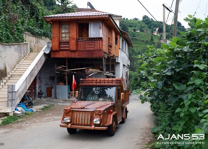 Rize'nin Güneysu ilçesinde yaşayan marangoz Metin Tercan, 1988 model otomobilini, ahşap kaplayarak kamyonete dönüştürdü.