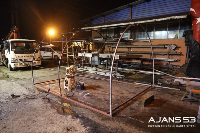 Rize Belediyesi Atölyesi’nde imalatına devam edilen Çadır Kent malzemeleri, 15 şubat akşamı 10 adet tıra yüklenerek Rize’den Hatay’a doğru yola çıkacak.