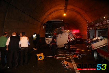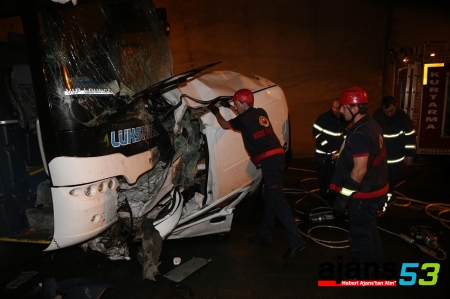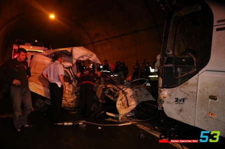 Alınan bilgiye göre, Ömer Kızılay'ın (23) kullandığı 25 LE 997 plakalı kamyonet, Rize-Trabzon karayolu İyidere Tüneli mevkisinde karşı şeride geçerek Erkan Genç idaresindeki Rize-Ankara seferini yapan 53 HP 707 plakalı yolcu otobüsüyle çarpıştı.