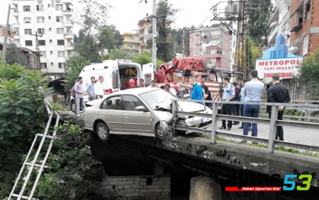 Rize`de hamile bir kadının bulunduğu araç, yaklaşık beş metre yükseklikteki köprüden son anda aşağıya düşmesini köprü kenarlıkları önledi.