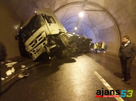 Rize'den Kocaeli istikametine giden Faik Dalkılıç idaresindeki 08 K 7263 plakalı çay gübresi yüklü tır, Tekkebak Tüneli'nde sürücünün direksiyon hakimiyetini kaybetmesi sonucu bariyerlere çarptı.