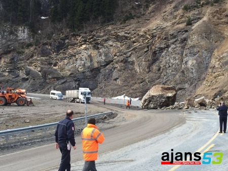 Yola düşen kayanın Karayolları ekipleri tarafından kırılarak kaldırılması için çalışma sürerken, Trabzon Trafik Bölge Müdürlüğü ekipleri de yola çıkan araçları dikkatli olmaları konusunda uyarıyor.