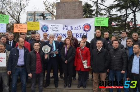 Atatürk Alanı Meydan Parkı'ndaki Atatürk Büstü önünde bugün Türk Sağlık Sen Trabzon Şubesi Başkanı Mustafa Serdar ve beraberindekiler dün Boztepe Mahallesi'ndeki Aile Sağlığı Merkezi'nde görevli Dr. Hasan Eraydın'a yönelik silahlı tehdit olayını düzenledikleri basın açıklaması ile protesto etti.