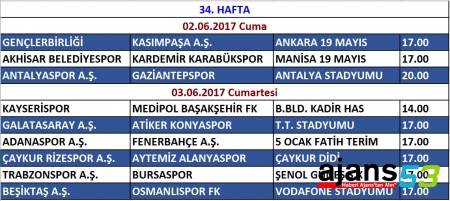2016-2017 Spor Toto Süper Lig Turgay Şeren Sezonu 34. hafta programı açıklandı. 2 ve 3 Haziran'da oynanacak 34. hafta karşılaşmalarının programı şöyle: