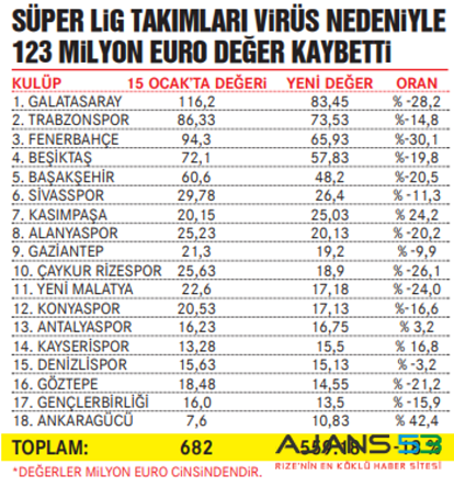 Koronavirüs salgını nedeniyle futbol ekonomisi değer kaybederken, süper ligde mücadele eden 18 takım içinde Çaykur Rizespor toplamda yüzde 26 değer kaybederek Fenerbahçe ve G.Saray'ın ardından en çok piyasası düşen 3.takım oldu.