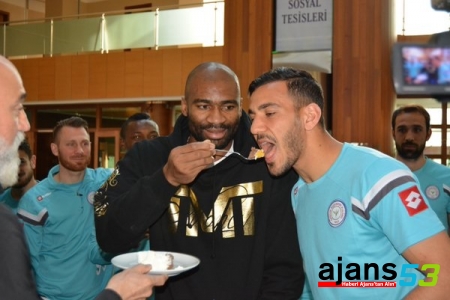 Koltuk değneği ile tesislere gelen Kweuke, forvette partneri Deniz Kadah'ı doğum gününde ilk tebrik eden kişi olurken, takım arkadaşını kendi elleriyle besledi.