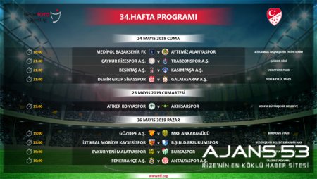 Spor Toto Süper Lig 34. hafta programı açıklandı. 2018 -2019 Spor Toto Süper Lig Lefter Küçükandonyadis Sezonu 34. hafta müsabaka programı açıklandı.