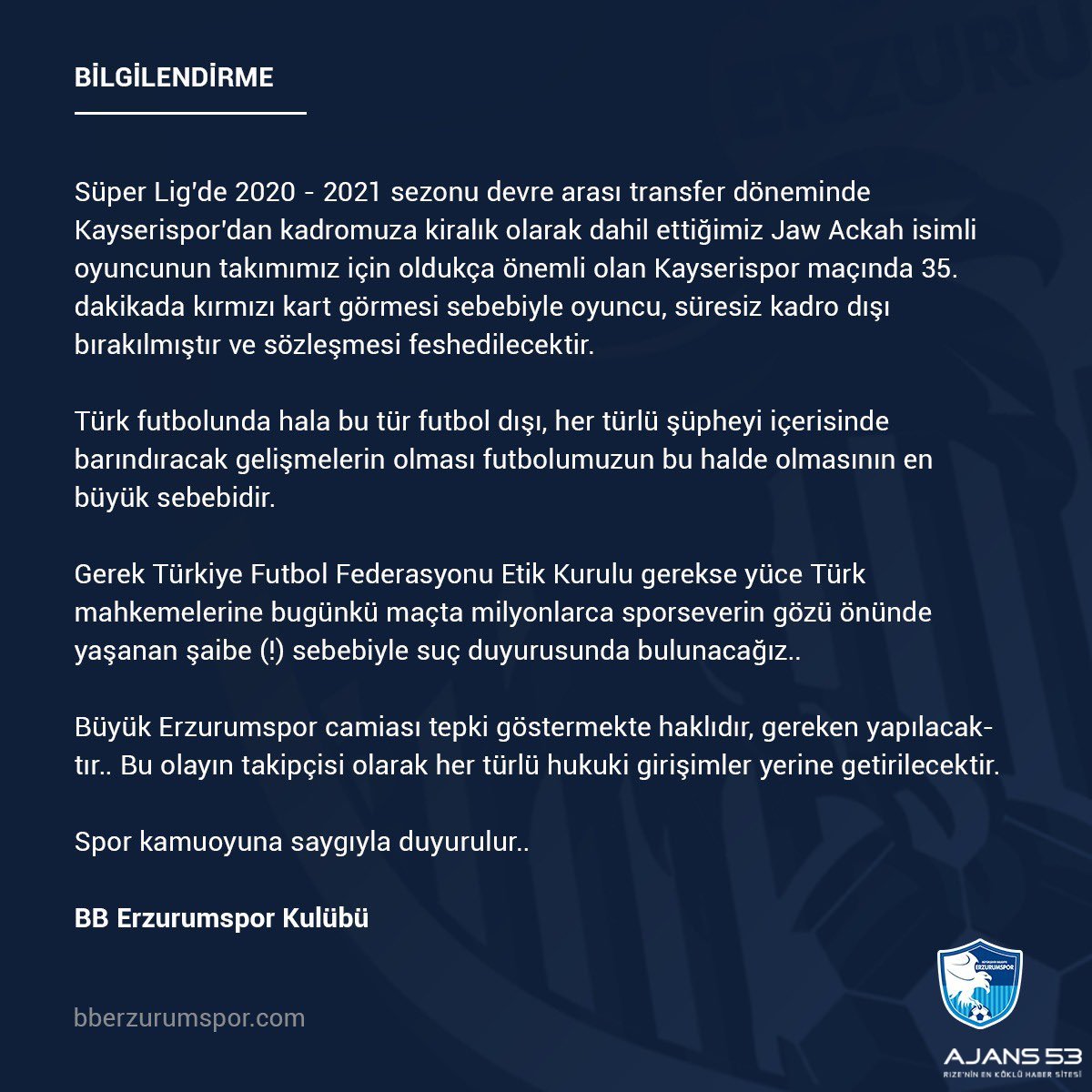Maç sonrası açıklama yapan Erzurumspor kulübü, oyuncunun süresiz kadro dışı bırakıldığını ve sözleşmesinin feshedileceğini duyurdu. Açıklamada, “Türk futbolunda hala bu tür futbol dışı, her türlü şüpheyi içerisinde barındıracak gelişmelerin olması futbolumuzun bu halde olmasının en büyük sebebidir. Gerek Türkiye Futbol Federasyonu Etik Kurulu gerekse yüce Türk mahkemelerine bugünkü maçta milyonlarca sporseverin gözü önünde yaşanan şaibe sebebiyle suç duyurusunda bulunacağız” ifadelerine yer verildi.