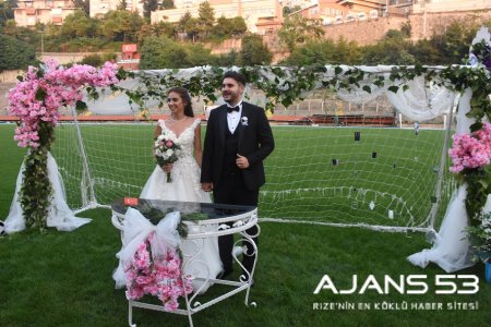 Futbol antrenörü Berkin Yavuz, çiçeklerle süslenen kale direği ve ölen babasının karton maketi önünde stadyumda düzenlenen törenle Tuğçe Ülkü Okan ile evlendi.