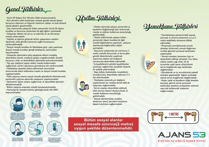 Rize Ticaret Borsası (RTB) Kovid-19 salgınında çay üretiminde alınması gereken önlemlerin nasıl olması gerektiğini anlatan afiş ve broşürleri çay fabrikalarına ve alım yerlerine dağıtılmaya başlandı. Ayrıca güvenli üretim yapmak için üyelerimize maske dağıtımına başladık.