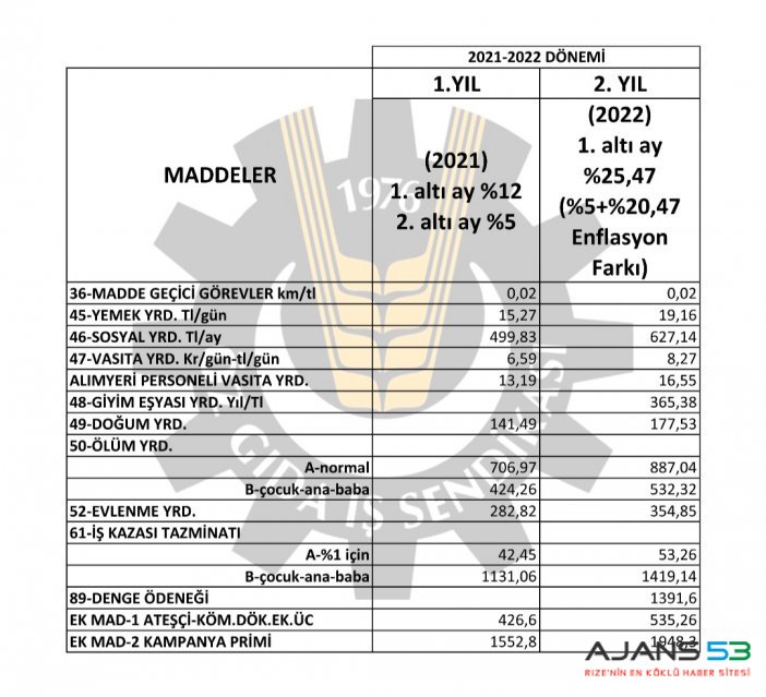 İmzalamış olduğumuz 2021-2022 yıllarını kapsayan Toplu İş Sözleşmesinde 2021 yılında ilk altı ay zammı %12, ikinci altı ay zammı %5+enflasyon farkı şeklindeydi. Enflasyon farkının ve 2022 yılı ilk altı ay %5 zam oranının eklenmesiyle birlikte toplam zam oranı %25,47 ( olarak saat ücretlerimize yansımıştır.