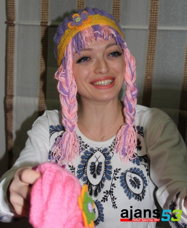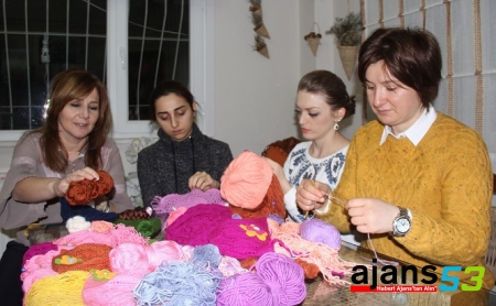 Rize’de Ebruli Yaşam Derneği üyesi bayanlar, lösemi hastası çocuklara hediye etmek üzere üzerlerinde ipten saçlar bulunan bereler örüyor.